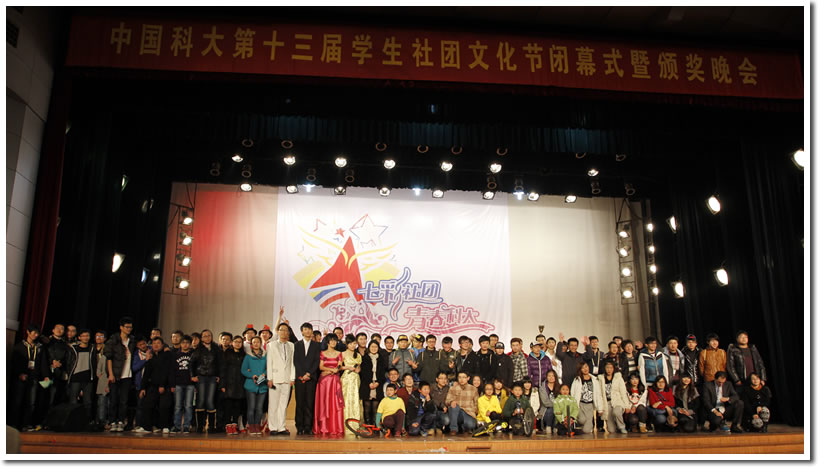 2012年12月2日晚,我校第十三届学生社团文化节闭幕式暨颁奖晚会在东区大礼堂顺利召开,同时也标志着主题为“七彩社团,青春科大”的第十三届学生社团文化节圆满落幕。