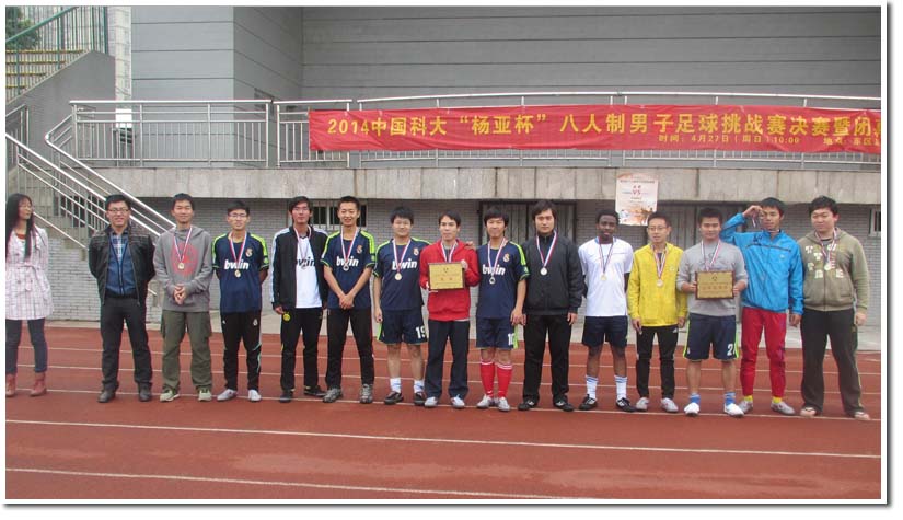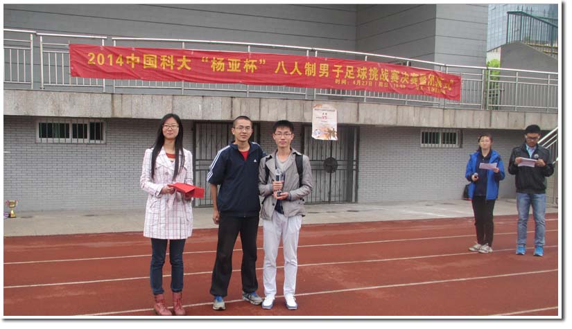 2014年4月27日星期日上午,由校团委、校学生社团管理指导委员会主办,杨亚校友基金协办,校学生足球协会承办的第四届中国科大“杨亚杯”八人制男子足球挑战赛决赛暨闭幕式在东区足球场进行。校团委张平老师,校学生社团管理指导委员会李晨晖同学、校学生足球协会孙赵亿同学等出席了闭幕式,并为获奖球队和个人颁奖。至此,历时近两个月的第四届中国科大“杨亚杯”八人制男子足球挑战赛圆满落下帷幕。